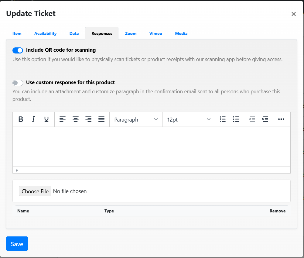The "Responses" tab on the ticket on SpurrOpen, allows you to issue QR codes as well as customize responses on a product. To activate, ensure that the required toggle switch is turned on.